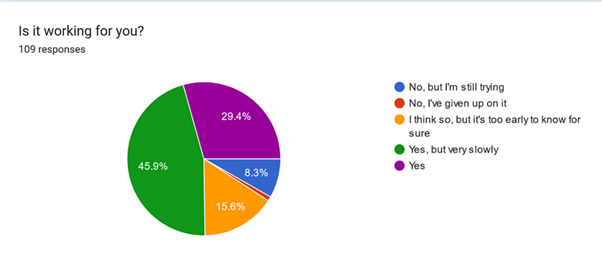 However, and more importantly, I think the supplements are maybe being used as a bit of a guise to make people think that the “program” is working. Whereas, in reality, it’s very likely that it’s simply just the low vitamin A diet aspect of “the program” that’s responsible for it working. This has absolutely been proven out by many other people doing just fine with the low vA diet on their own. From way back in 2020 my survey results showed that most people (~80%) were reporting the low vA diet was working for them.